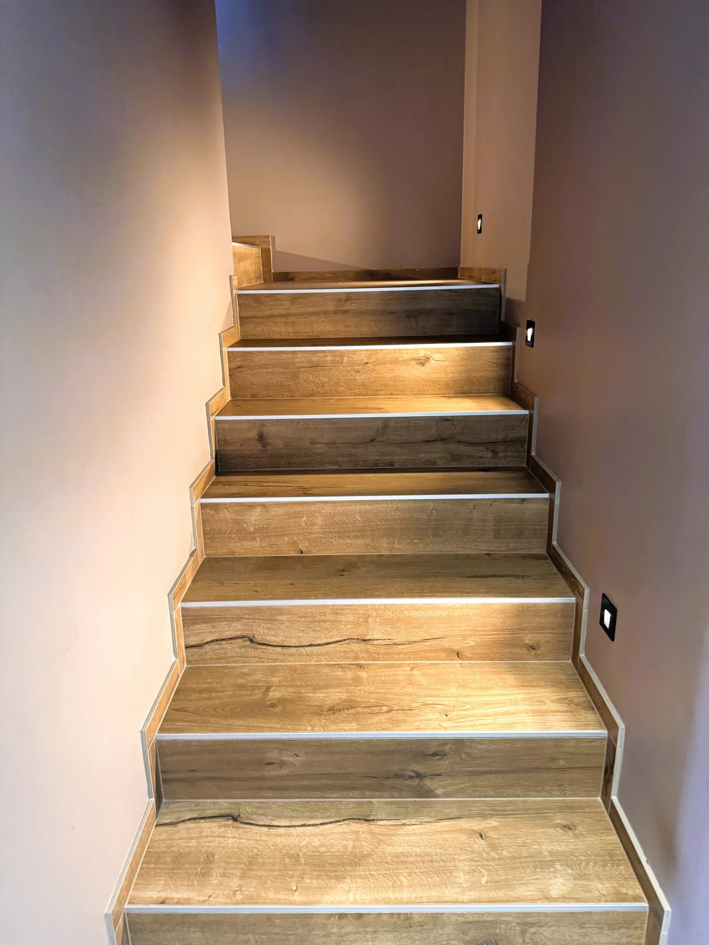 A staircase with built-in spotlights leads to the first floor, which is arranged as follows: