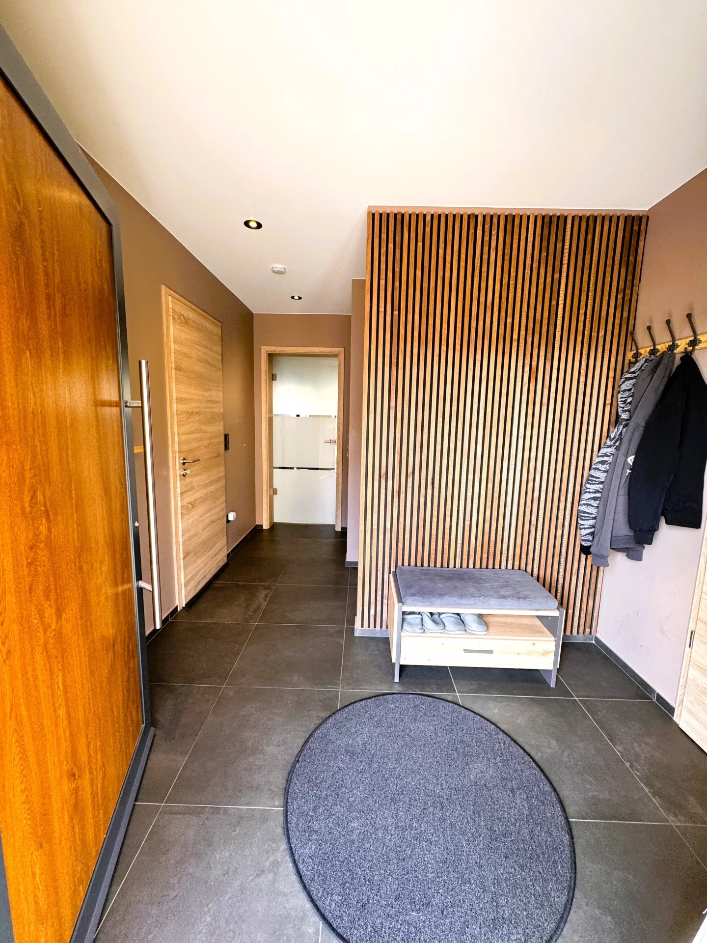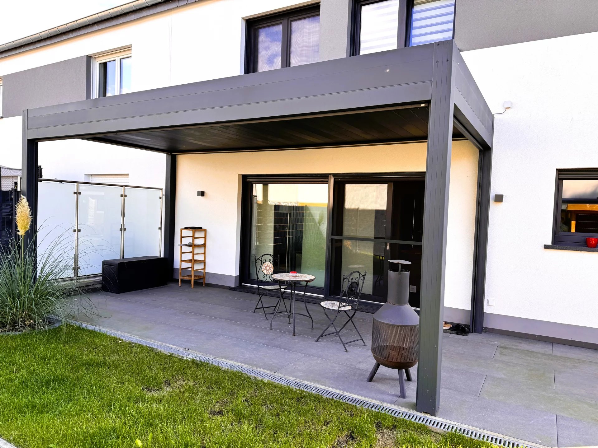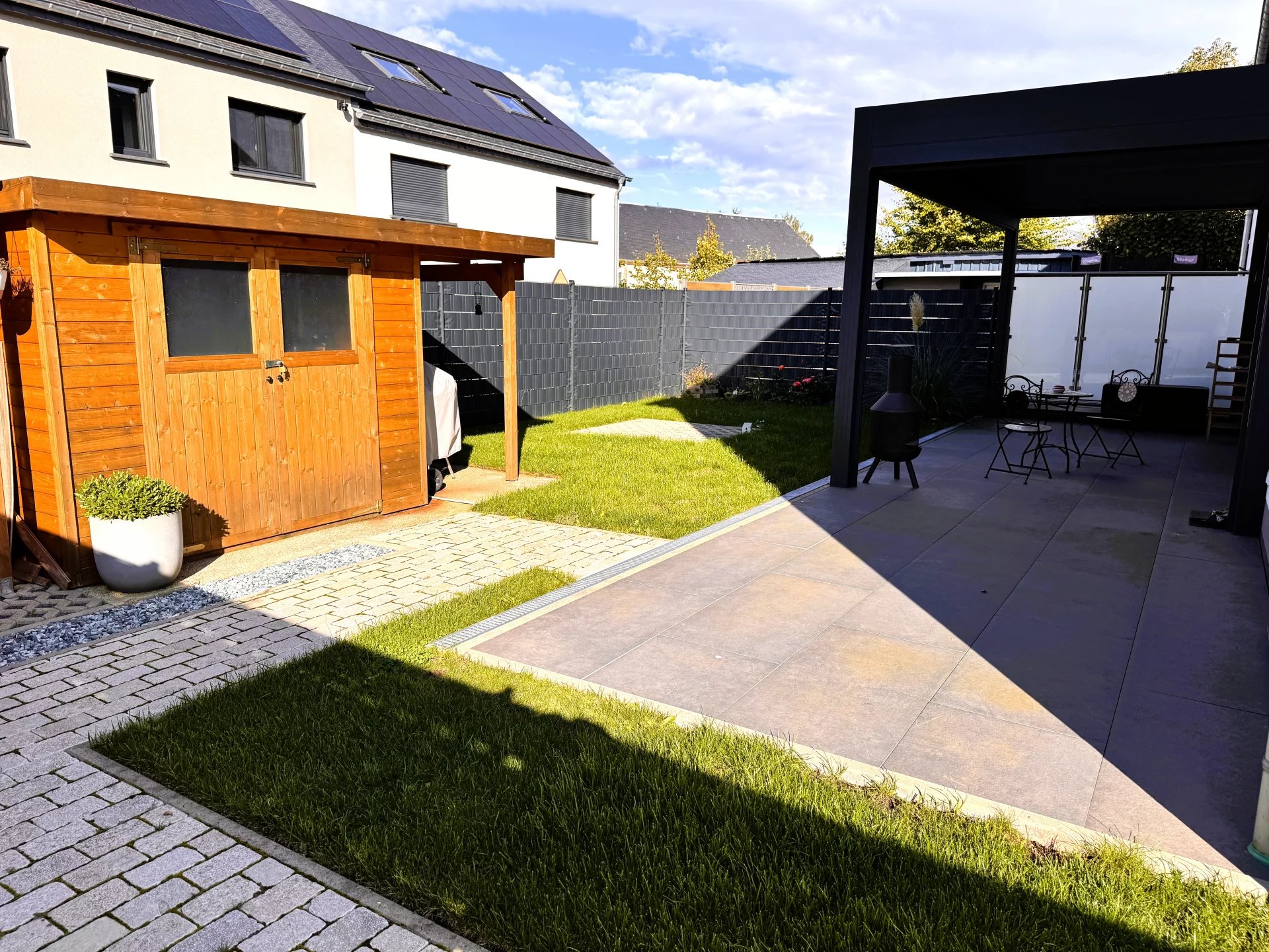 - a bright living room with an open, fully equipped kitchen of approx. 46.21 sqm and access to the terrace of approx. 32.89 sqm (partially covered by a pergola) and to the garden, which includes a garden shed,