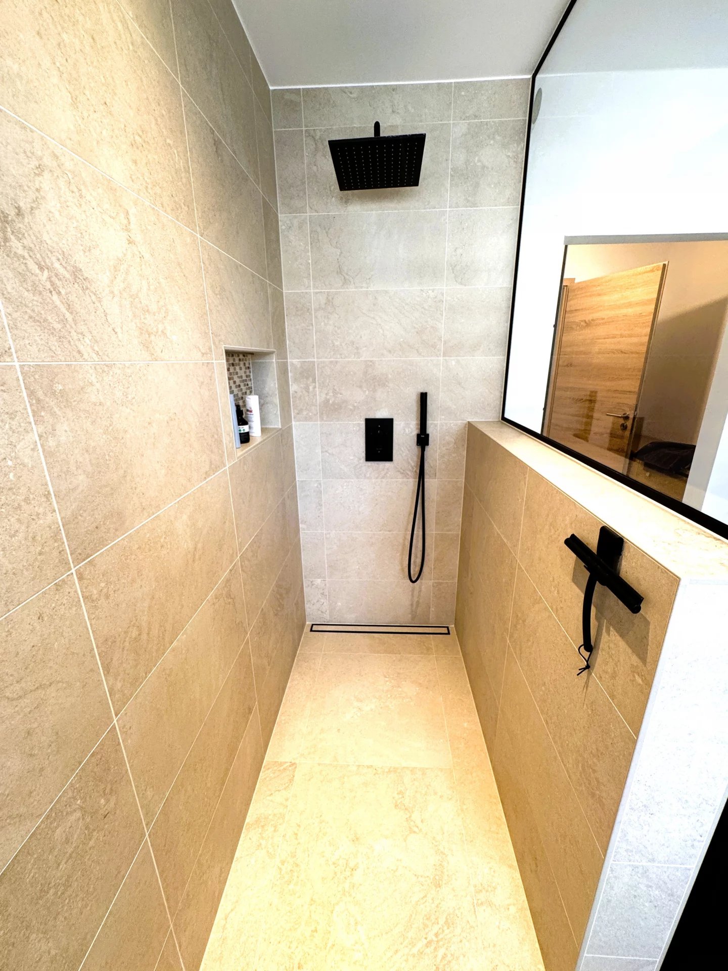 - a second bathroom (with window) of approx. 6.73 sqm featuring a wall-hung toilet, a sink with vanity unit and mirror, and a spacious italian-style shower.